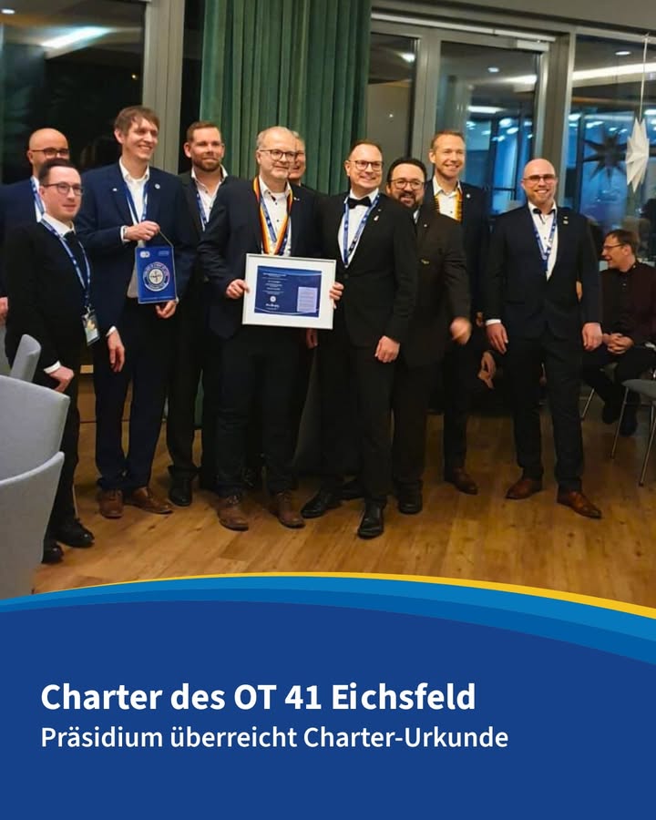 Das OTD-Präsidium, vertreten durch Präsident Matthias Hardinghaus und Vizepräsident Michael Selzer, überreichte die offizielle Charter-Urkunde. Mit diesem Schritt ist OT 41 Eichsfeld nun ganz offiziell ein fester Bestandteil der Old-Tablers-Gemeinschaft.